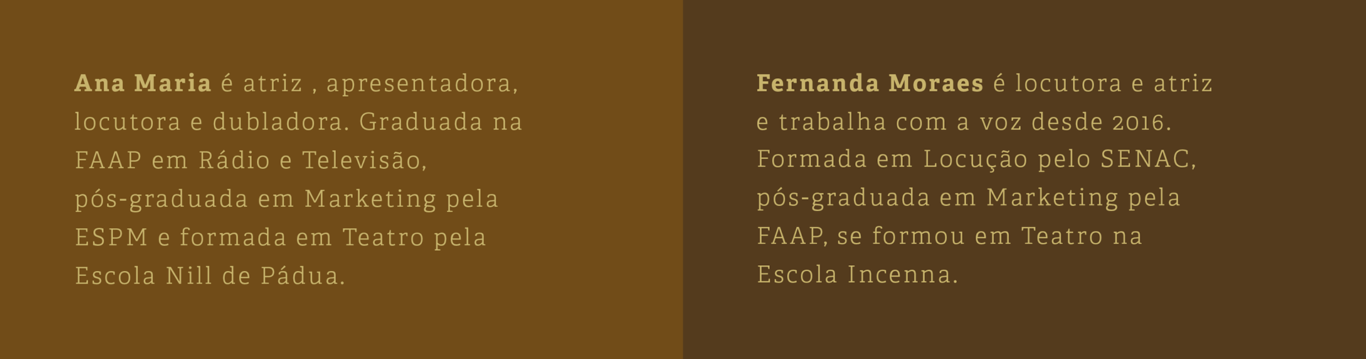 Juntas colecionam trabalhos e histórias com grandes marcas e clientes. São propagandas, audiolivros, filmes, sistemas de atendimento eletrônico e outros produtos que levam a voz de ambas a muitos lugares.